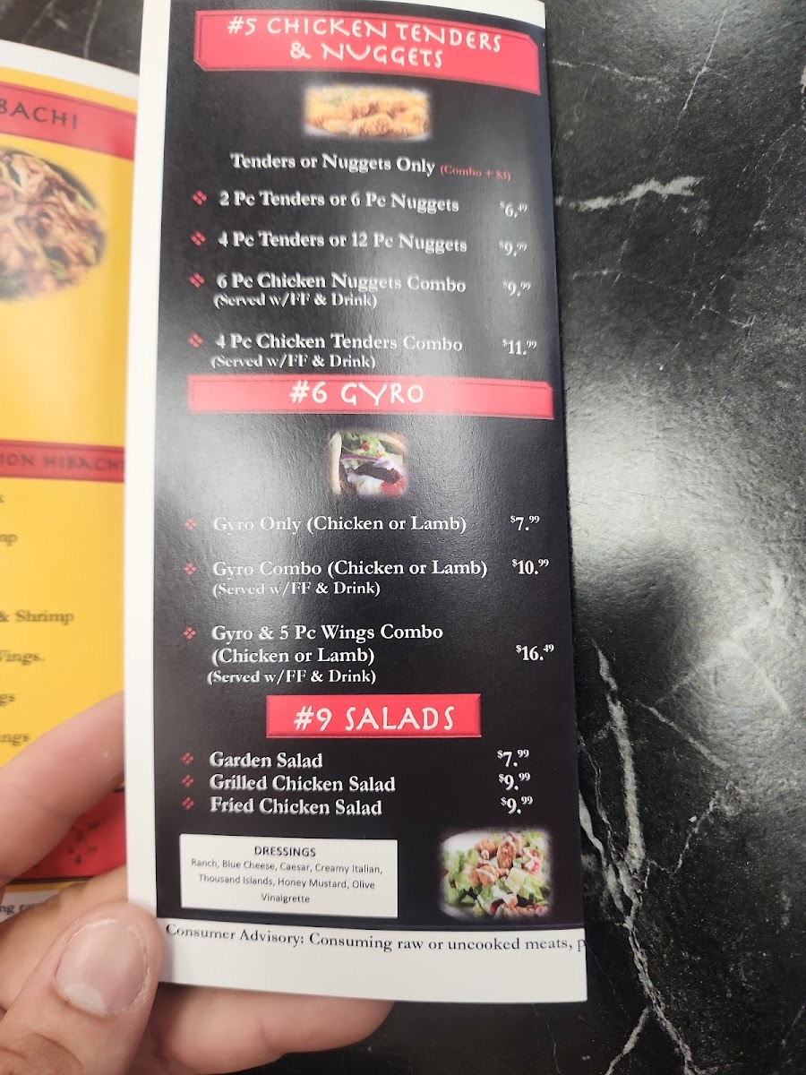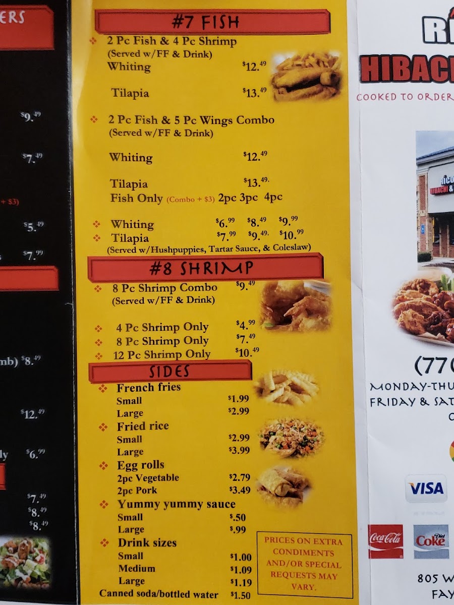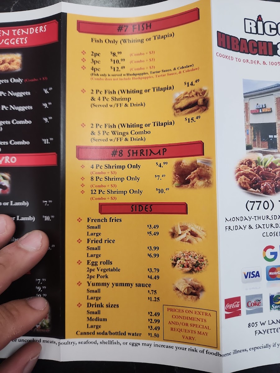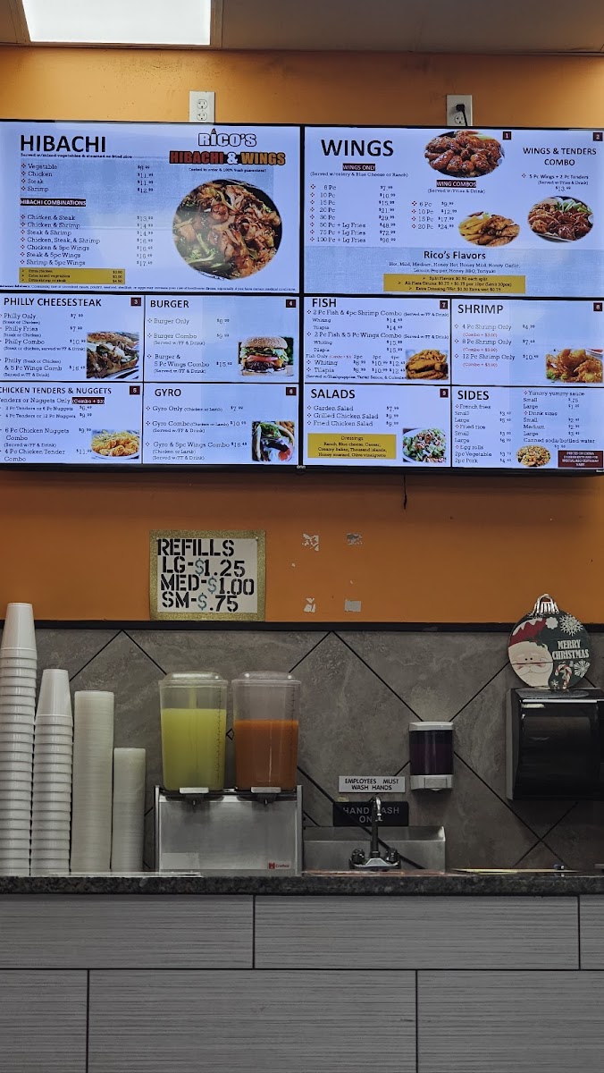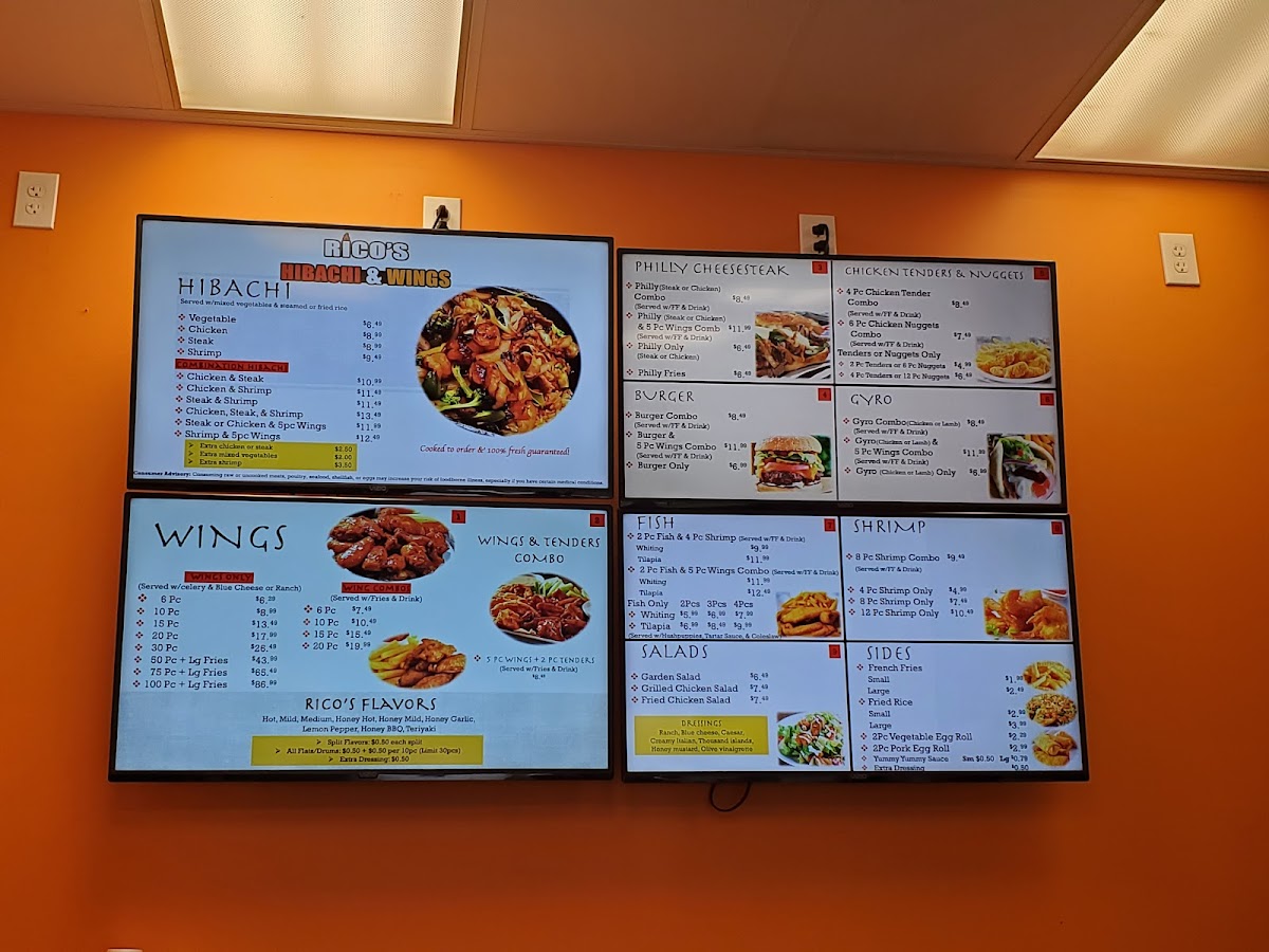 Mediterranean flavors are represented with Gyro Only (Chicken or Lamb), Gyro Combo (Chicken or Lamb), and Gyro (Chicken or Lamb) & 5pc Wings Combo, while seafood lovers can choose Fish Only options-2pc, 3pc, or 4pc Whiting or Tilapia-or go for Fish Combos like 2pc (Whiting or Tilapia) & 5pc Wings and 2pc (Whiting or Tilapia) & 4pc Shrimp. Shrimp fans aren’t left out either, with 4pc Shrimp Only, 8pc Shrimp Only, and 12pc Shrimp Only. To balance it all, lighter choices like Garden Salad, Grilled Chicken Salad, and Fried Chicken Salad are available, along with classic sides such as Small Fries, Large Fries, Small Rice, Large Rice, and 2pc Vegetable Eggroll. Overall, the menu feels cohesive yet diverse, making Rico’S Hibachi & Wings a reliable one-stop spot for bold flavors, generous portions, and crowd-pleasing variety.